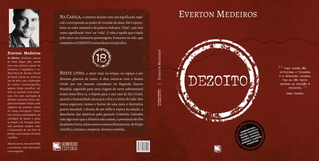 “Na Cabala, o número dezoito tem um significado especial e corresponde ao poder de vontade da alma. Ele é equivalente ao valor numérico da palavra hebraica “Chai”, que tem como significado “vivo” ou “vida”. E vida é aquilo que é dado pelo autor aos inúmeros personagens, humanos ou não, que compõem os DEZOITO contos desta variada obra. Neste livro, o autor viaja no tempo, no espaço e por diversos gêneros de conto.